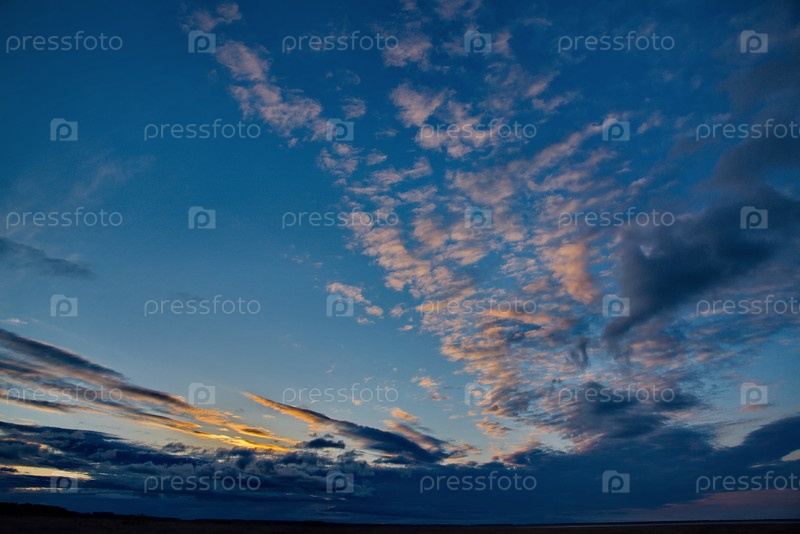Россия. Юг Западной Сибири. Панорама вечернего летнего неба с разноцветными облаками над полями Кузнецкого Алатау