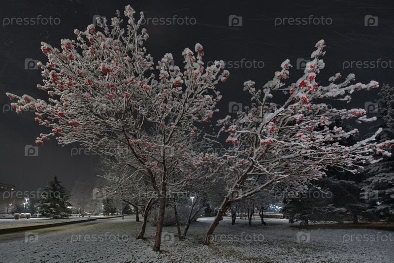 Новокузнецк, Россия. 01 ноября 2024 года. Живописный вид на деревья городского парка имени Георгия Жукова, покрытые первым осенним снегом и подсвеченные фонарями холодного света