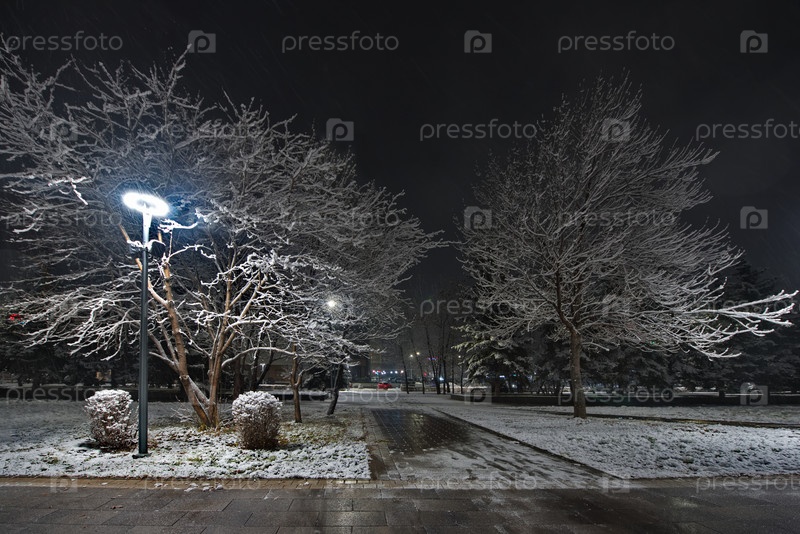 Новокузнецк, Россия. 01 ноября 2024 года. Живописный вид на деревья городского парка имени Георгия Жукова, покрытые первым осенним снегом и подсвеченные фонарями холодного света