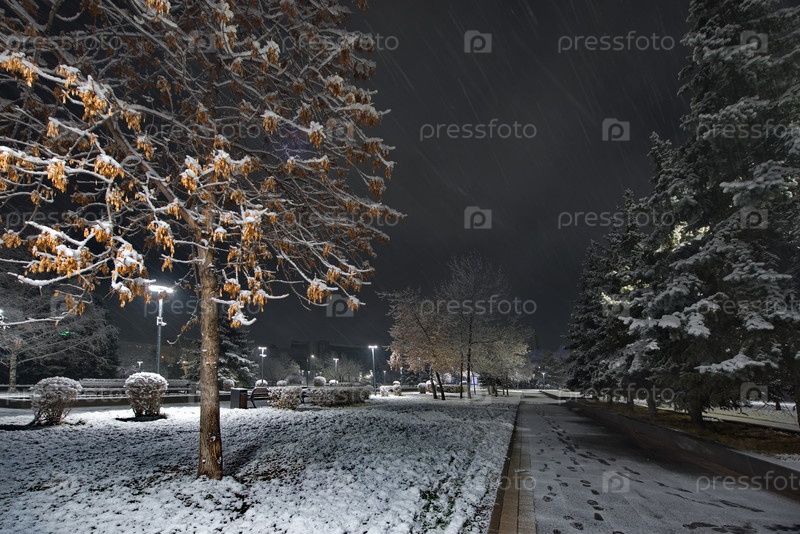 Новокузнецк, Россия. 01 ноября 2024 года. Живописный вид на деревья городского парка имени Георгия Жукова, покрытые первым осенним снегом и подсвеченные фонарями холодного света
