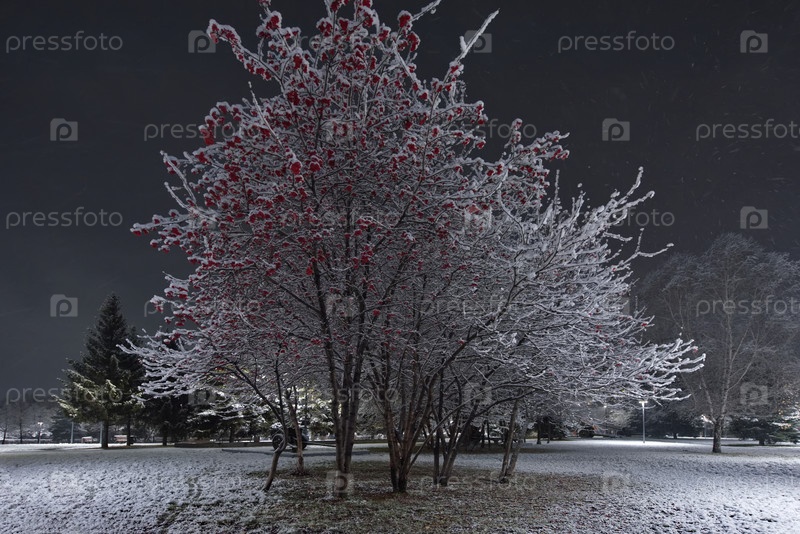 Новокузнецк, Россия. 01 ноября 2024 года. Живописный вид на деревья городского парка имени Георгия Жукова, покрытые первым осенним снегом и подсвеченные фонарями холодного света