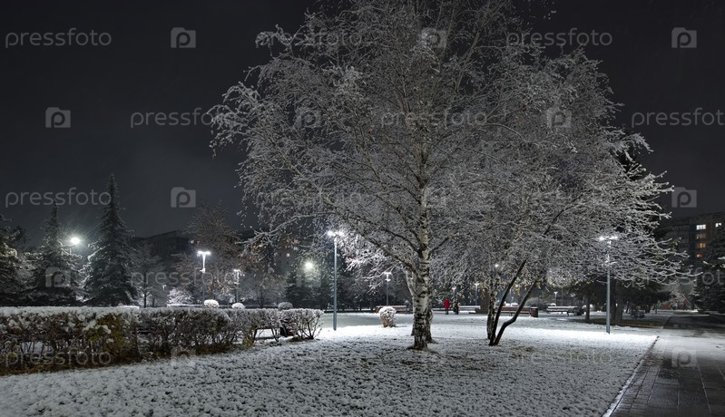 Новокузнецк, Россия. 01 ноября 2024 года. Живописный вид на деревья городского парка имени Георгия Жукова, покрытые первым осенним снегом и подсвеченные фонарями холодного света