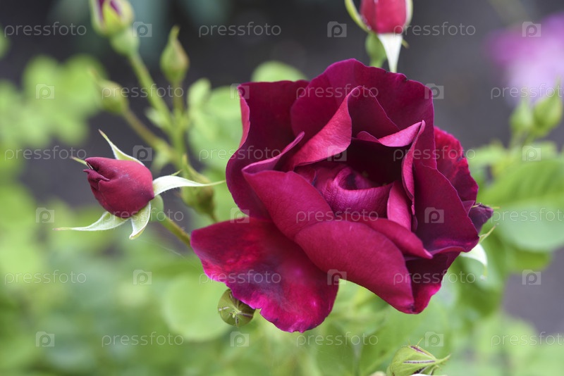 Темно-красные розовые цветы на зеленом кусте. Красивая роза в саду