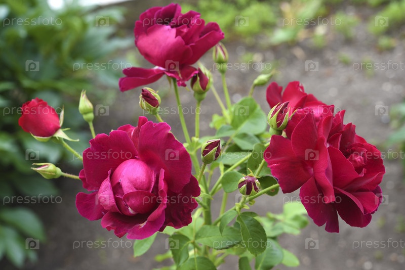 Темно-красные цветы розы на зеленом кусте. Красивая роза в саду