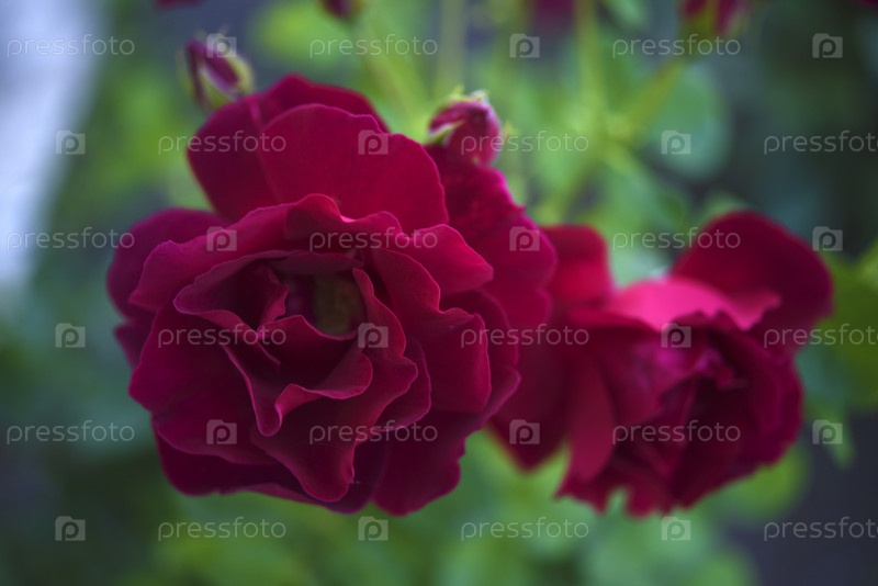 Темно-красные розовые цветы на зеленом кусте. Красивая роза в саду