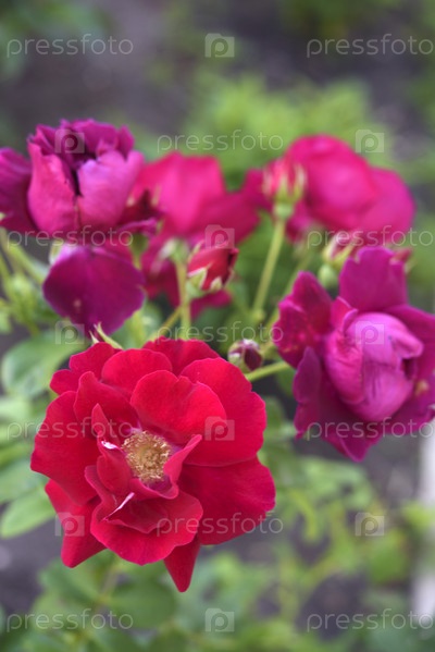 Темно-красные розовые цветы на зеленом кусте. Красивая роза в саду