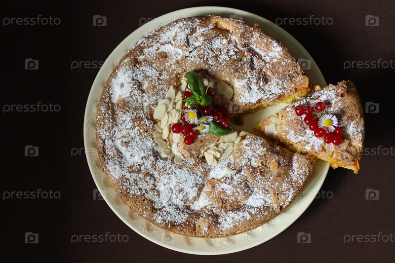 Вкусный домашний торт, украшенный миндалем, ягодами и сахарной пудрой