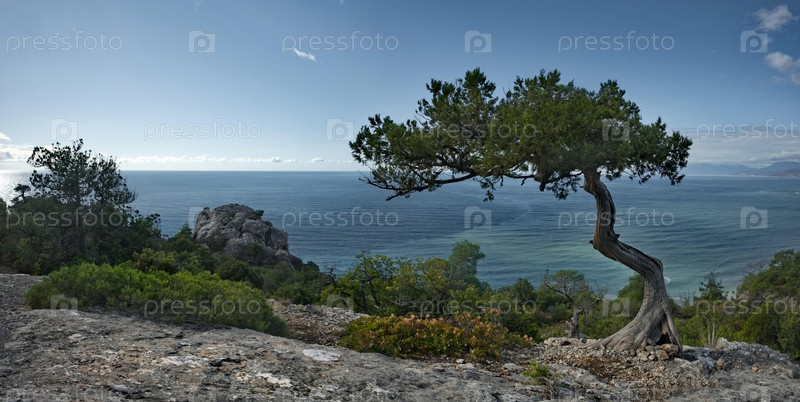 Россия, Новый Свет. Живописный вид на берег Черного моря с горы в окрестностях знаменитого мыса Капчик на Крымском полуострове