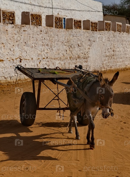 Шингетти. Мавритания. Грустный ослик запряженный в двухколесную тележку на городской улице. Здесь это самый распространенный вид транспорта