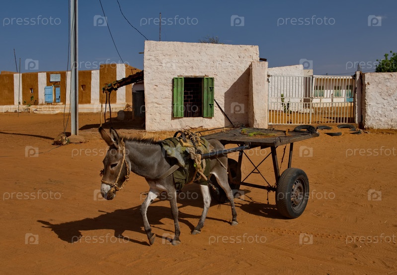 Шингетти. Мавритания. Грустный ослик запряженный в двухколесную тележку на городской улице. Здесь это самый распространенный вид транспорта