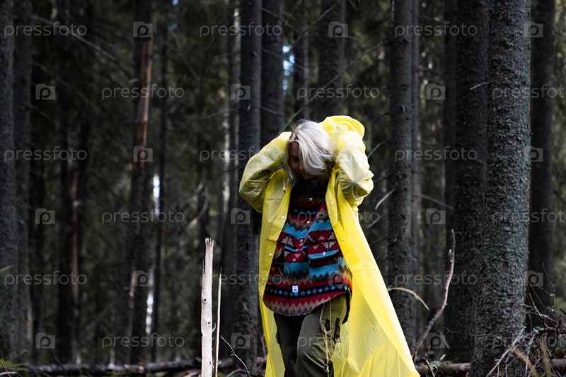 Девушка в осеннем лесу поправляет дождевик