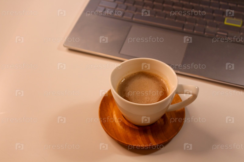 Ноутбук, белая чашка на деревянной подставке с кофе