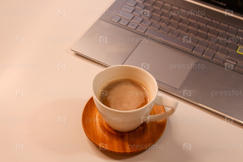Кружка кофе и ноутбук на светлом фоне