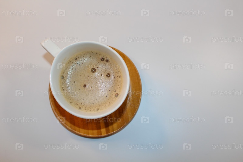Латте в красивой белой кружке на деревянной тарелке, нежная пенка