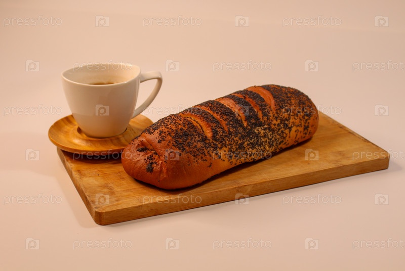 Золотистый хлеб с маком, кружка латте на деревянной доске