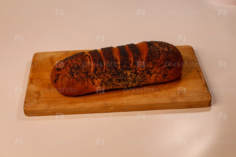 Свежая булочка с маком, вкусное тесто на деревянной доске