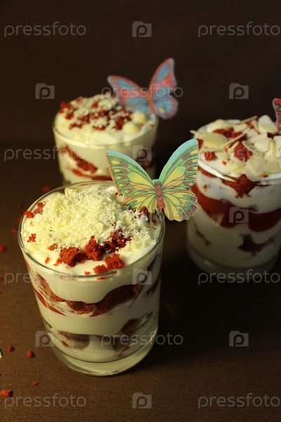 Кремовые парфе красного бархата, прослоенные крошками торта, стружкой белого шоколада и украшенные декоративными бабочками, создают восхитительный десерт