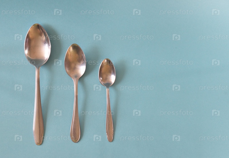 Три ложки, разложенные параллельно снизу вверх и изолированные на светло-голубом фоне