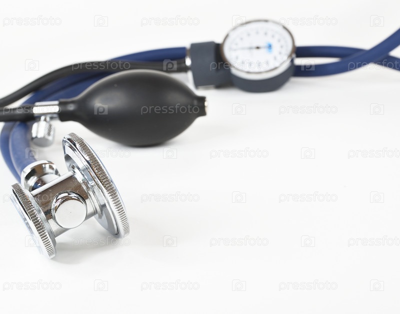 Компоненты стетоскопа. Акустическая головка находится на переднем плане, воздуходувка и манометр находятся на заднем плане и слегка размыты