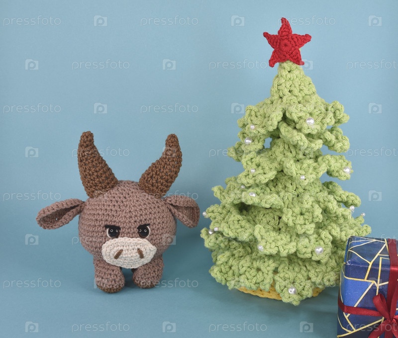 Вязаный бычок стоит рядом с вязаной рождественской елкой со звездой на макушке