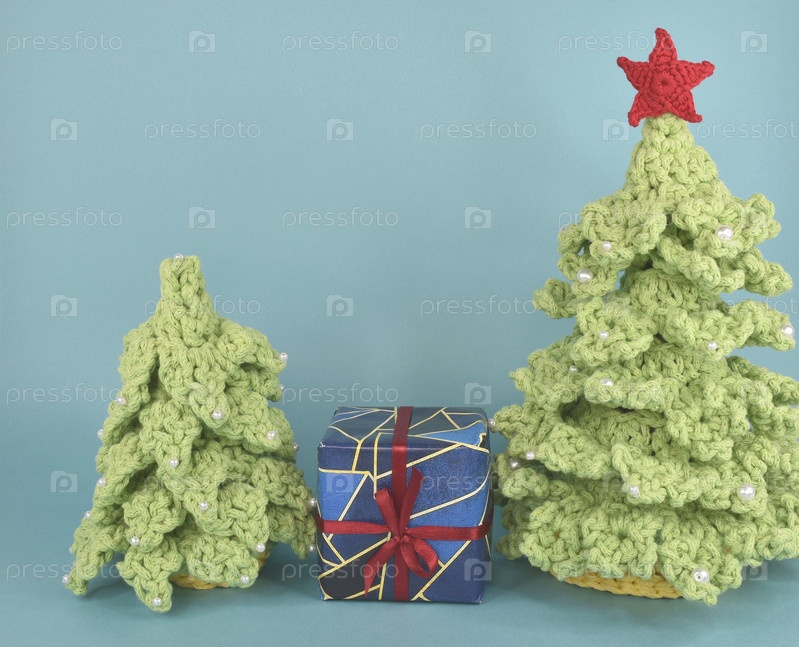 На синем фоне стоят две вязаные елки. Одна высокая с красной звездой на макушке, а другая низкая