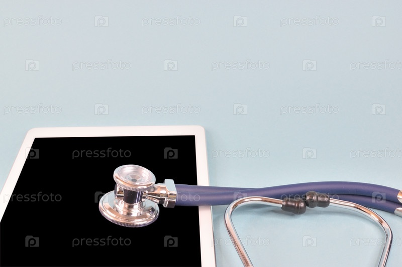 Акустическая головка лежит на планшетном компьютере, рядом с ней — оголовье стетоскопа