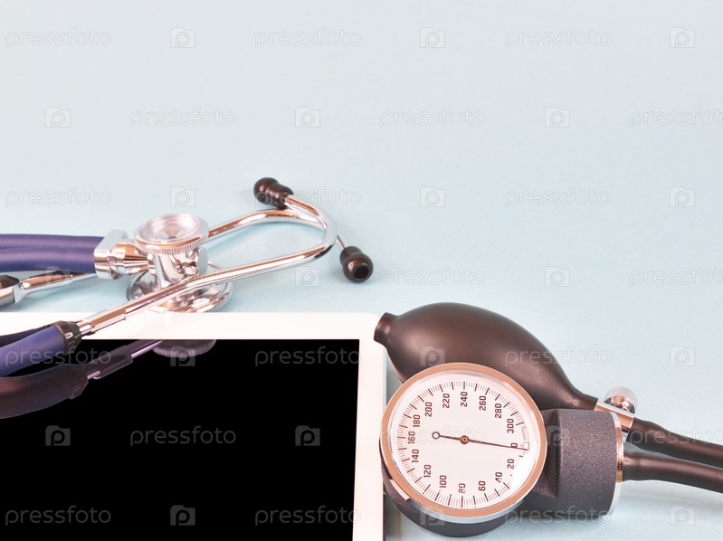 Стетоскоп, лежащий на планшетном компьютере, воздуходувка и манометр для измерения давления