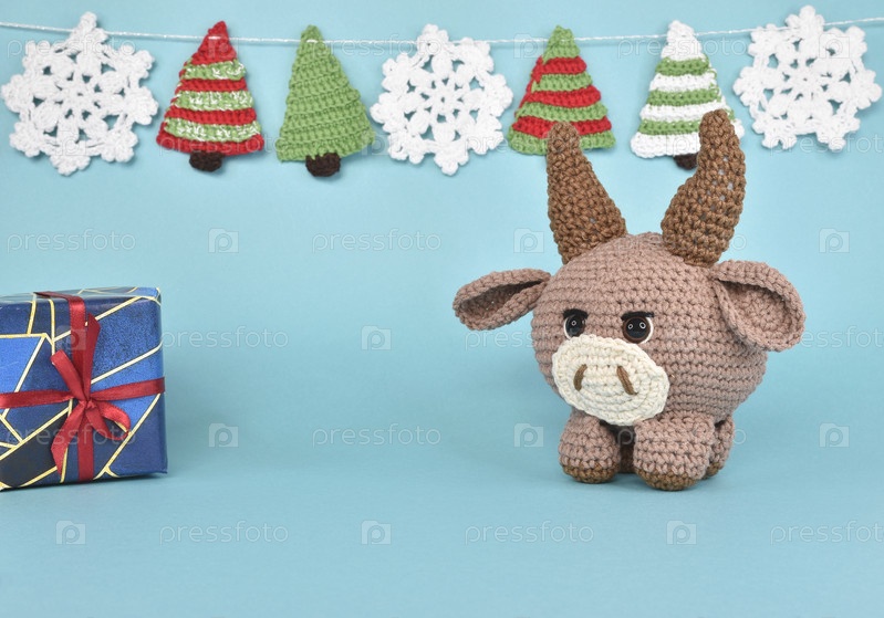 Вязаный бычок стоит рядом с новогодним подарком, а над ним висит гирлянда из вязаных елок и снежинок