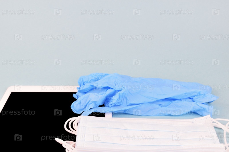 Медицинские перчатки, стопка масок и планшетный компьютер