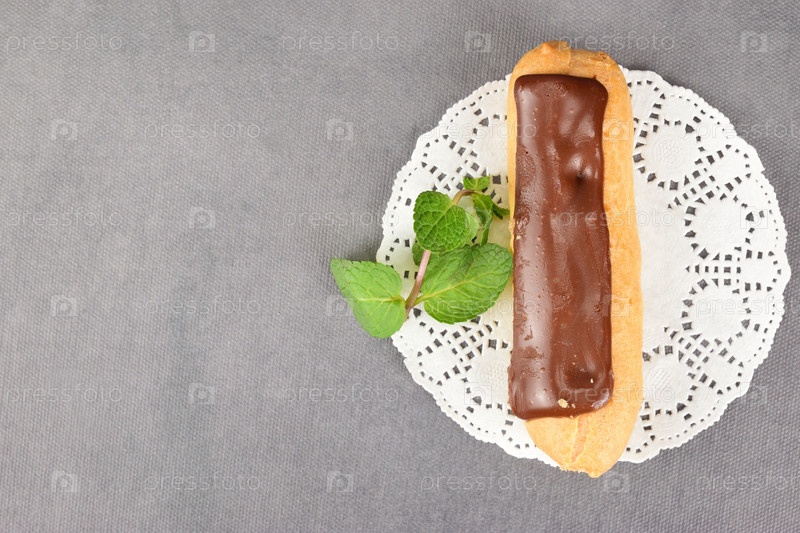 Эклер в шоколадной глазури лежит на белой узорчатой салфетке рядом с листьями мяты