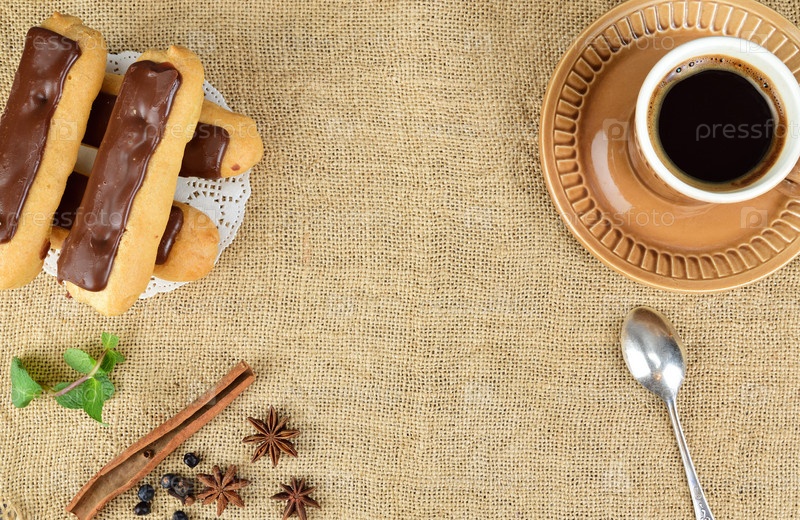 Вид сверху на шоколадные эклеры, кружку горячего кофе и чайную ложку. Рядом листья мяты, палочка корицы и звездочка бадьяна