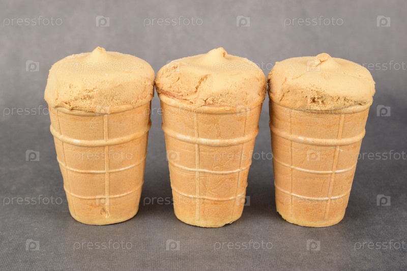 Три вафельных стаканчика с мороженым, стоящие рядом на темно-сером фоне