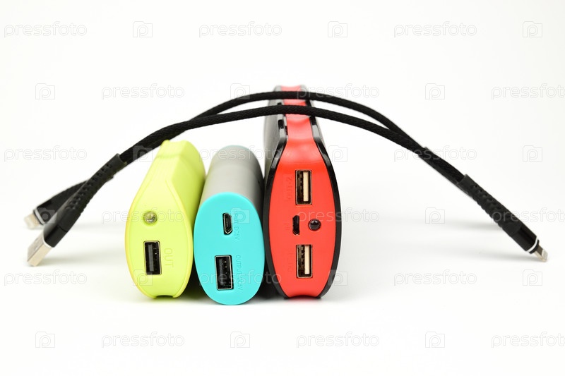 Три разных внешних аккумулятора для зарядки смартфонов, над ними лежат черные провода
