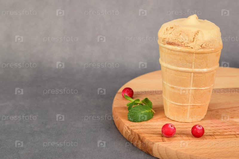 Стакан мороженого стоит на деревянной разделочной доске. Рядом лежат три ягоды клюквы и листочки мяты