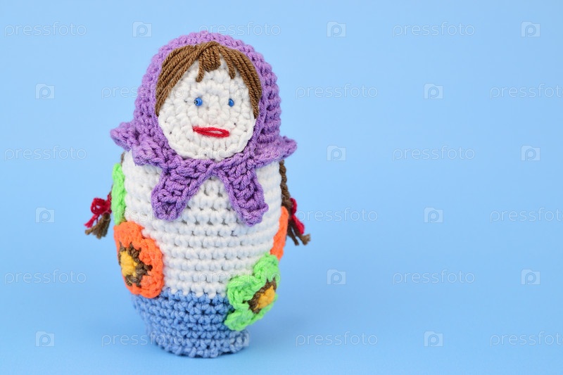 Вязаная кукла в сиреневой шали, изолированная на синем фоне