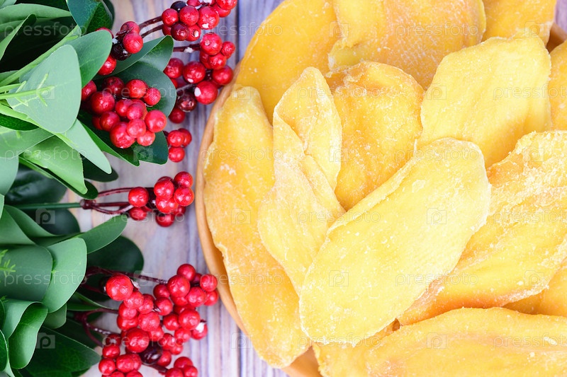 Вид сверху на сушеные ломтики манго, разложенные на деревянной тарелке. Рядом находятся искусственные ветки с красными ягодами