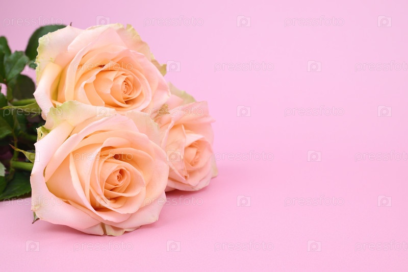 Три бутона роз лежат на нежно-розовом фоне