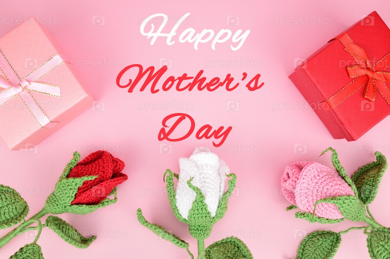 Красные и розовые подарочные коробки вместе с вязаными розами. Поздравления с праздником в центре