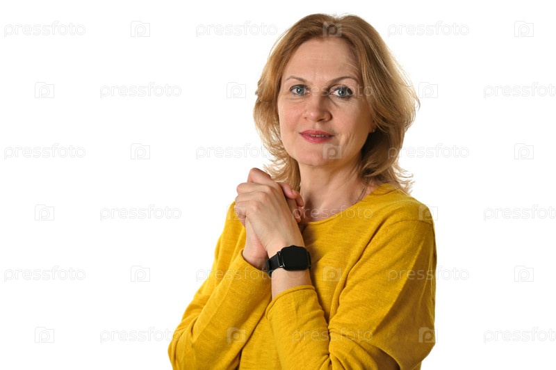 Взрослая привлекательная женщина в желтом джемпере нежно смотрит в камеру. Руки скрещены и прижаты к груди