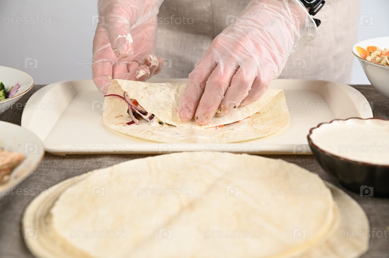Женщина в прозрачных перчатках заворачивает нарезанные овощи и жареную курицу в питу