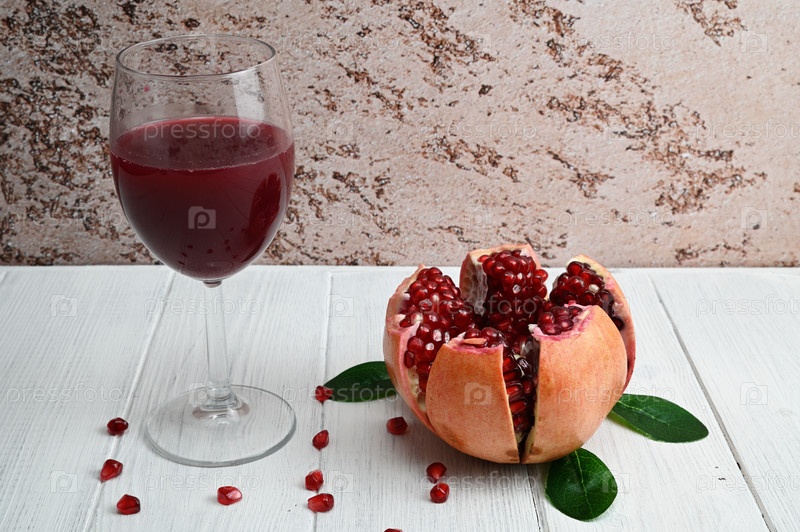 Стакан выжатого гранатового сока. Спелый гранат разрезанный и открытый