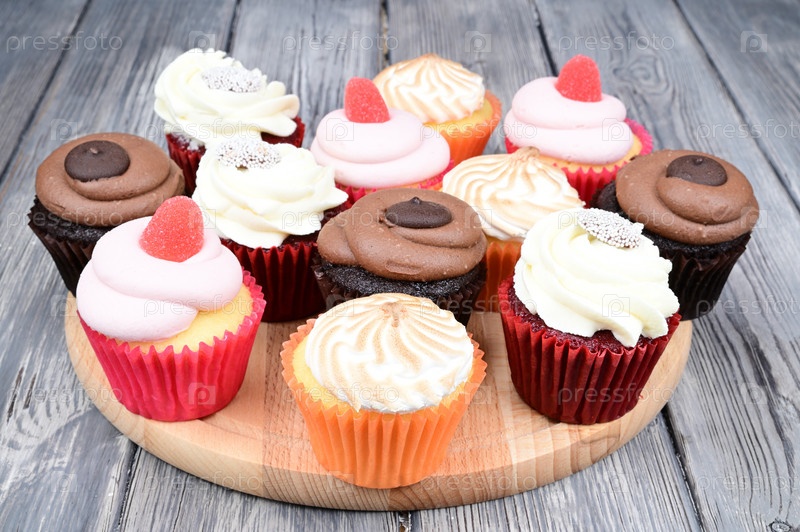 Вид сбоку на несколько разноцветных кексов, разложенных на деревянной разделочной доске