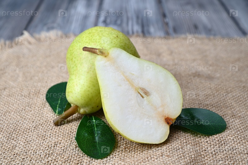 Одна целая зеленая груша и половина другой. Зеленые листья разбросаны вокруг. Груши на мешковине