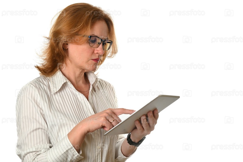 Взрослая привлекательная женщина держит планшет в левой руке. Она одета в светлую блузку и носит очки