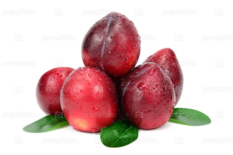 Красные сливы сложены в небольшую гроздь. На кожуре видны капельки воды