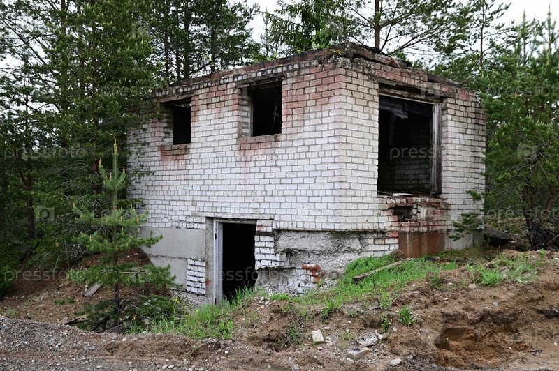 Разрушенное белое кирпичное здание, заросшее деревьями. Нет окон и дверей