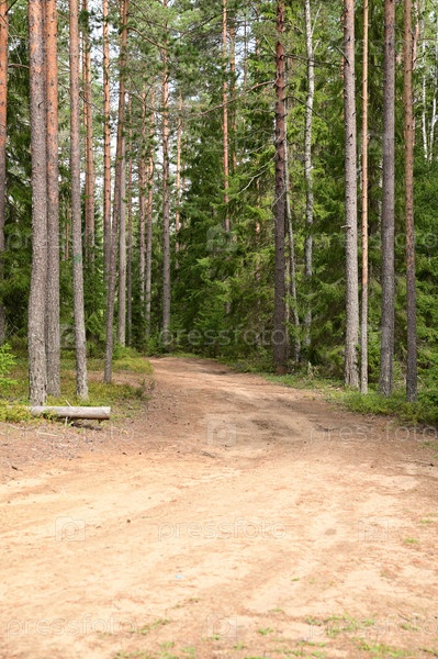 Лесная песчаная дорога в сосновом лесу. Срубленные спиленные деревья лежат на обочине дороги