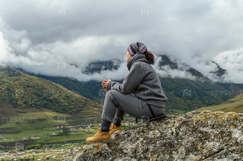 Женщина сидит на камне на вершине горы на уровне облаков и любуется горным пейзажем