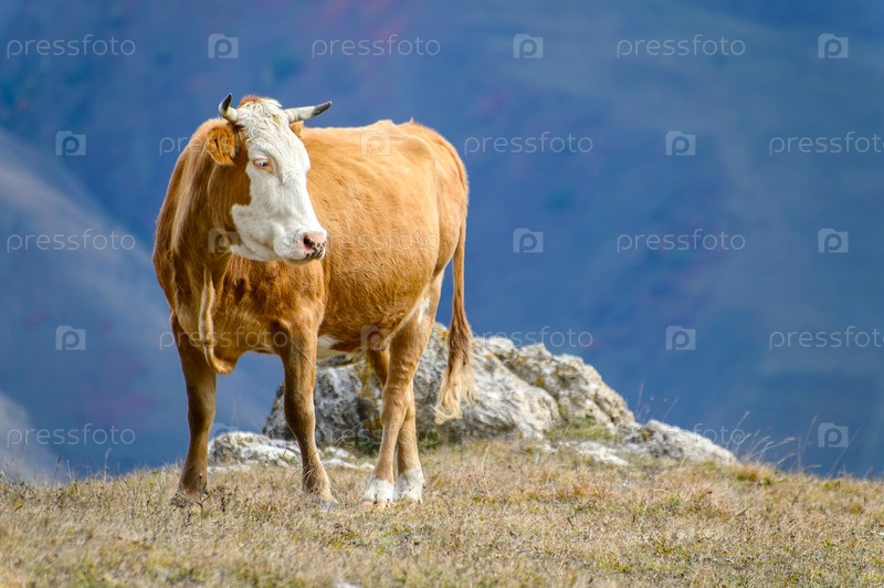 Коричневый бык с белой головой пасется на горном лугу. Сухая осенняя трава, каменные валуны