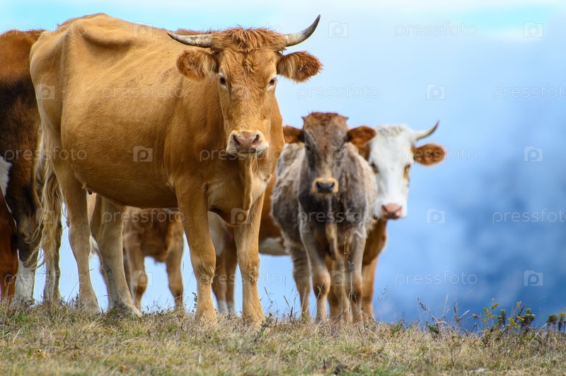 Рыжая корова перед стадом, пасущимся на осеннем поле